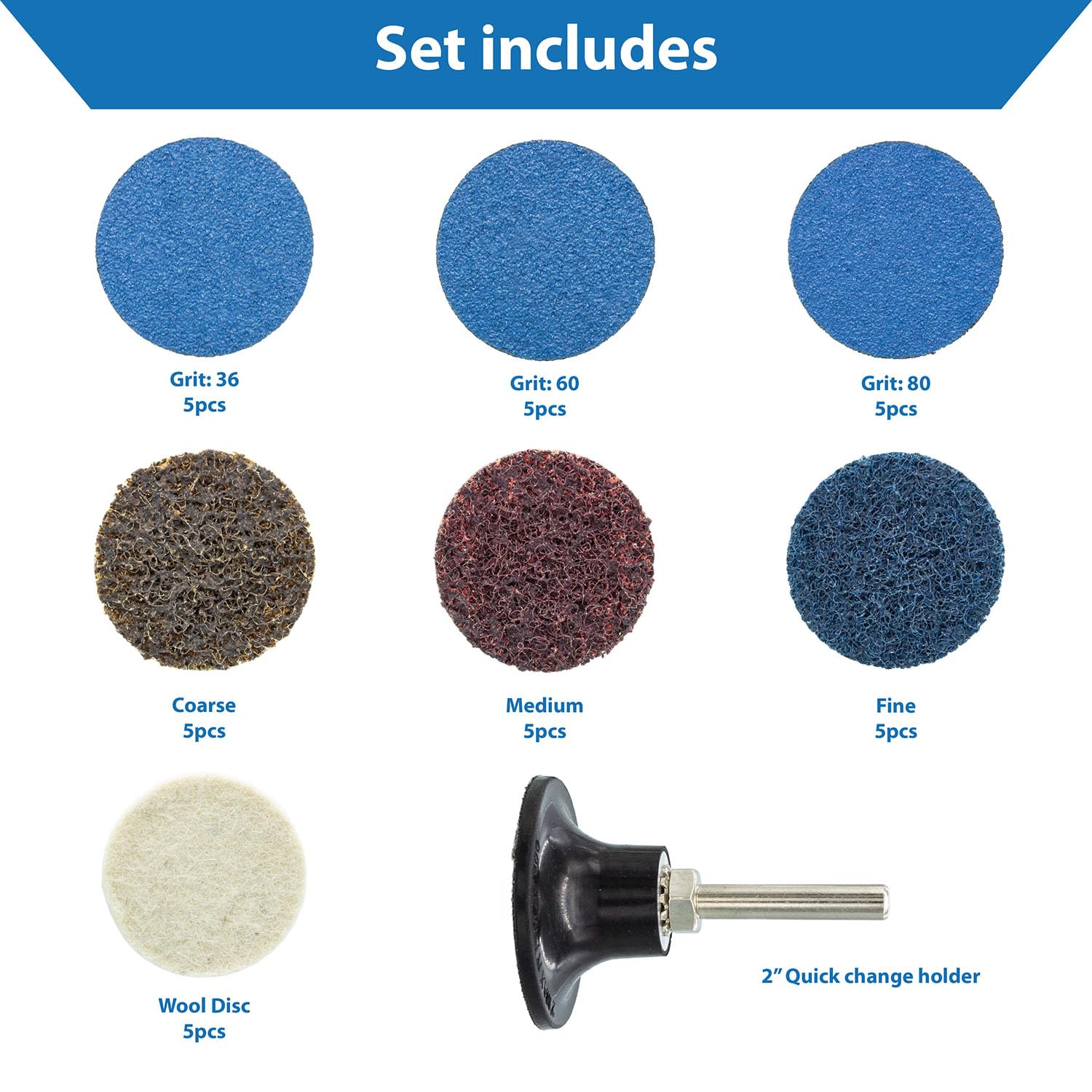Complete with a 1/4" shank holder, this set goes beyond a mere collection, offering stability and precision during operation. With 35 2" Quick Change discs, including Scotch Quality discs (Coarse/Brown, Medium/Red, Fine/Blue), Zirgonium discs (Grits 36, 60, 80), and Fleece Quick Change Discs, it's a comprehensive solution for varied surface conditioning tasks. From heavy material removal to achieving a polished finish, this set has you covered. Elevate your craftsmanship with a toolkit that anticipates your needs and transforms your approach to surface tasks.
