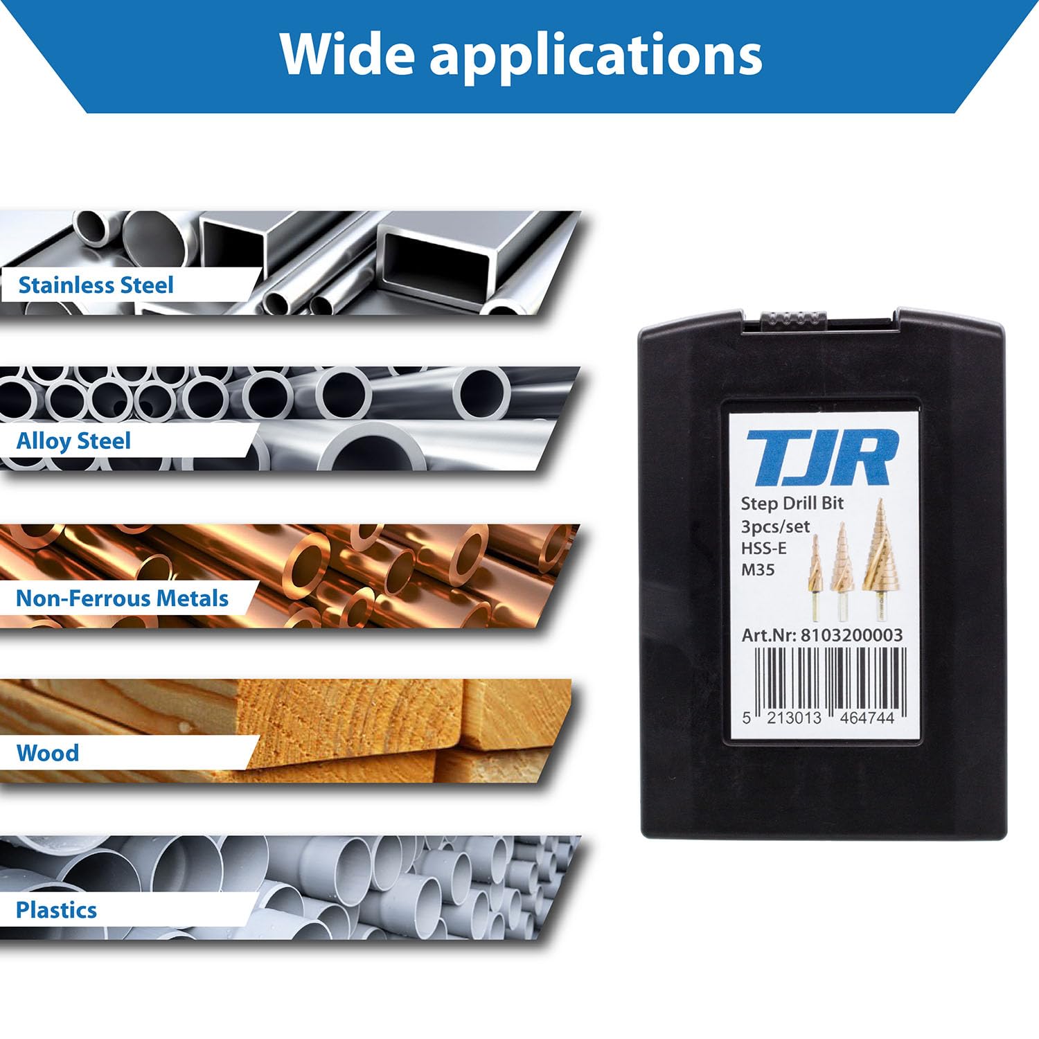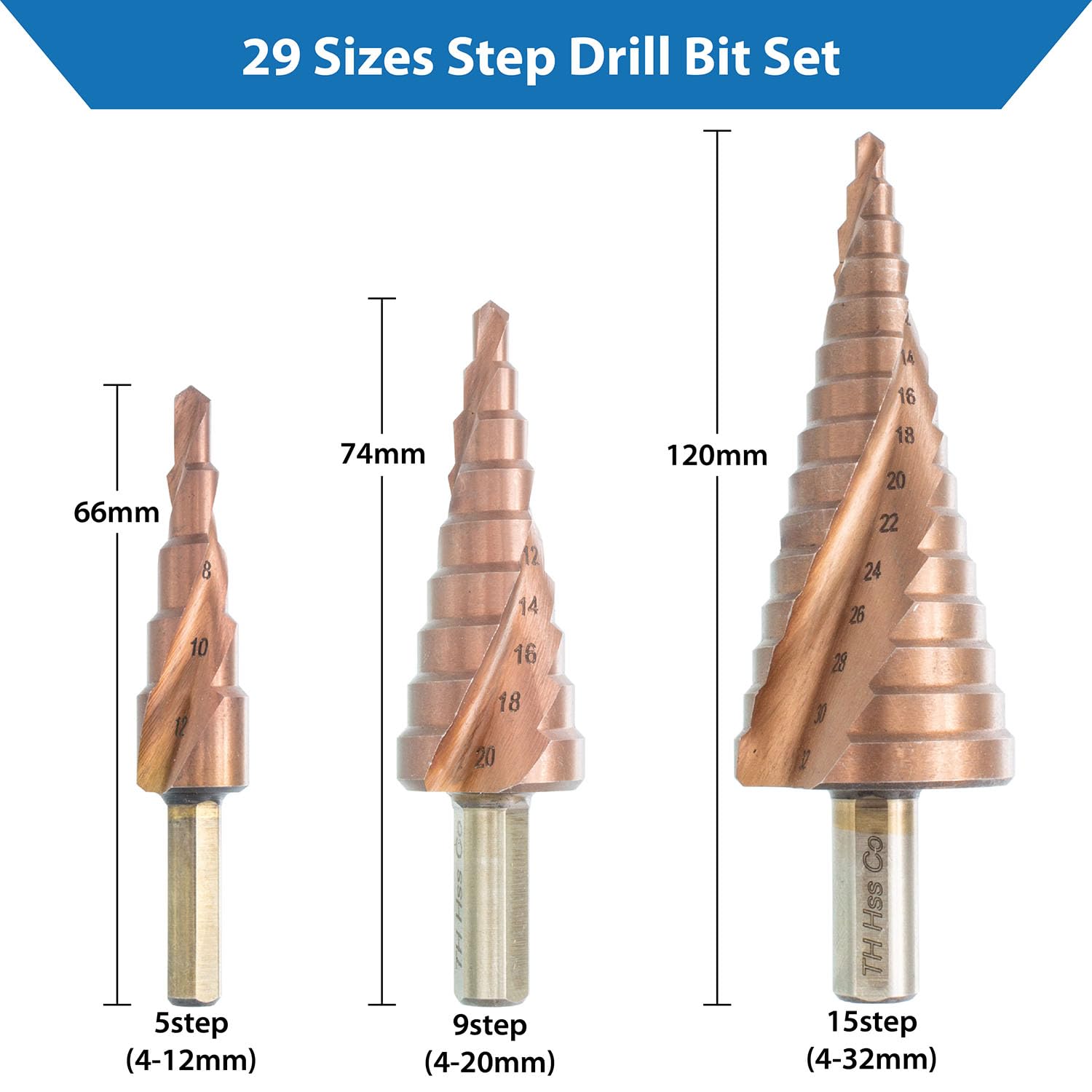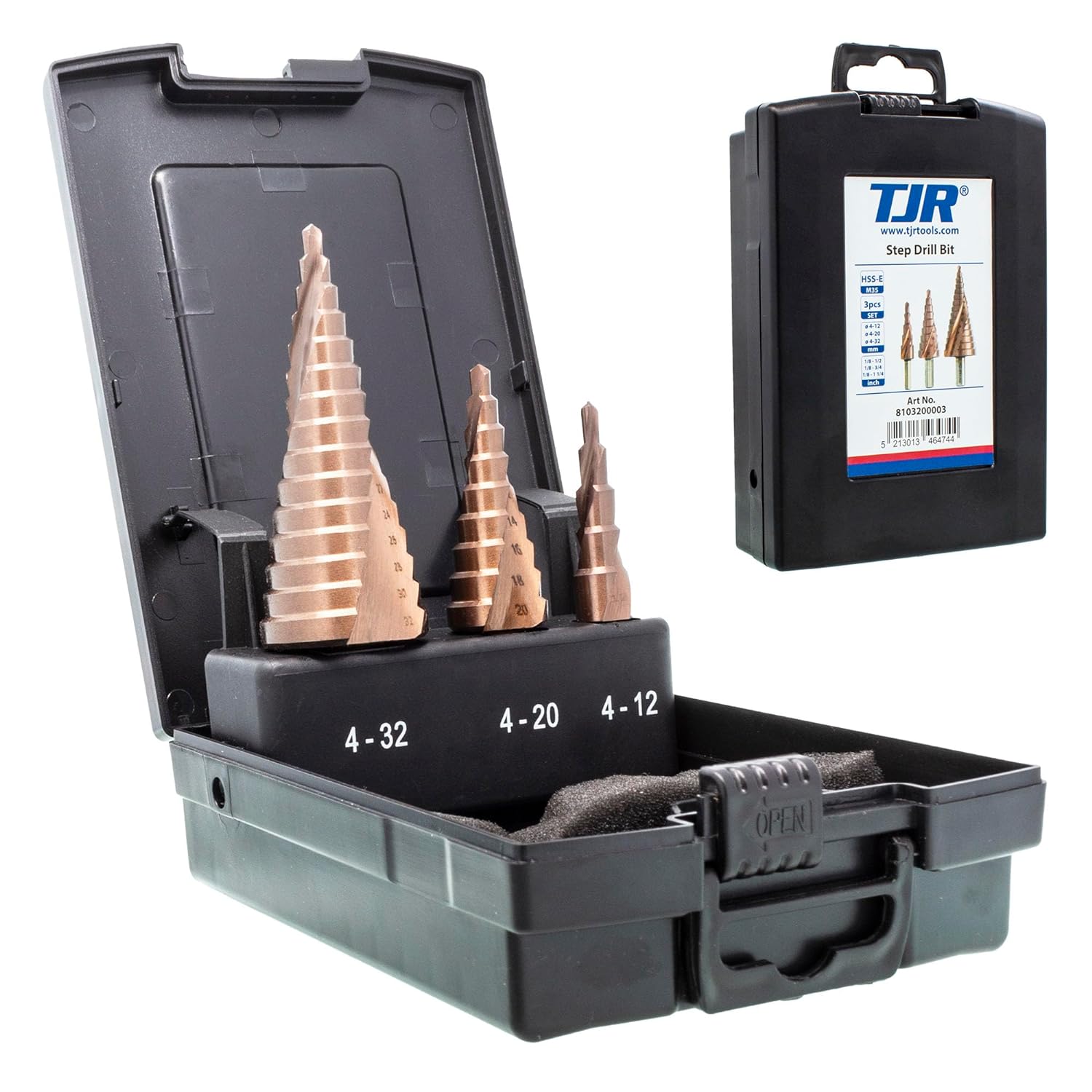 TJR® HSS-E M35 Cobalt Step Drill Bit Set, 3 Pcs, 2-fluted Spiral Grooved with 29 Step (4-32mm) Sizes Total for Faster Drilling in Stainless Steel, Alloy steel, Non-ferrous metals, Wood, Plastics