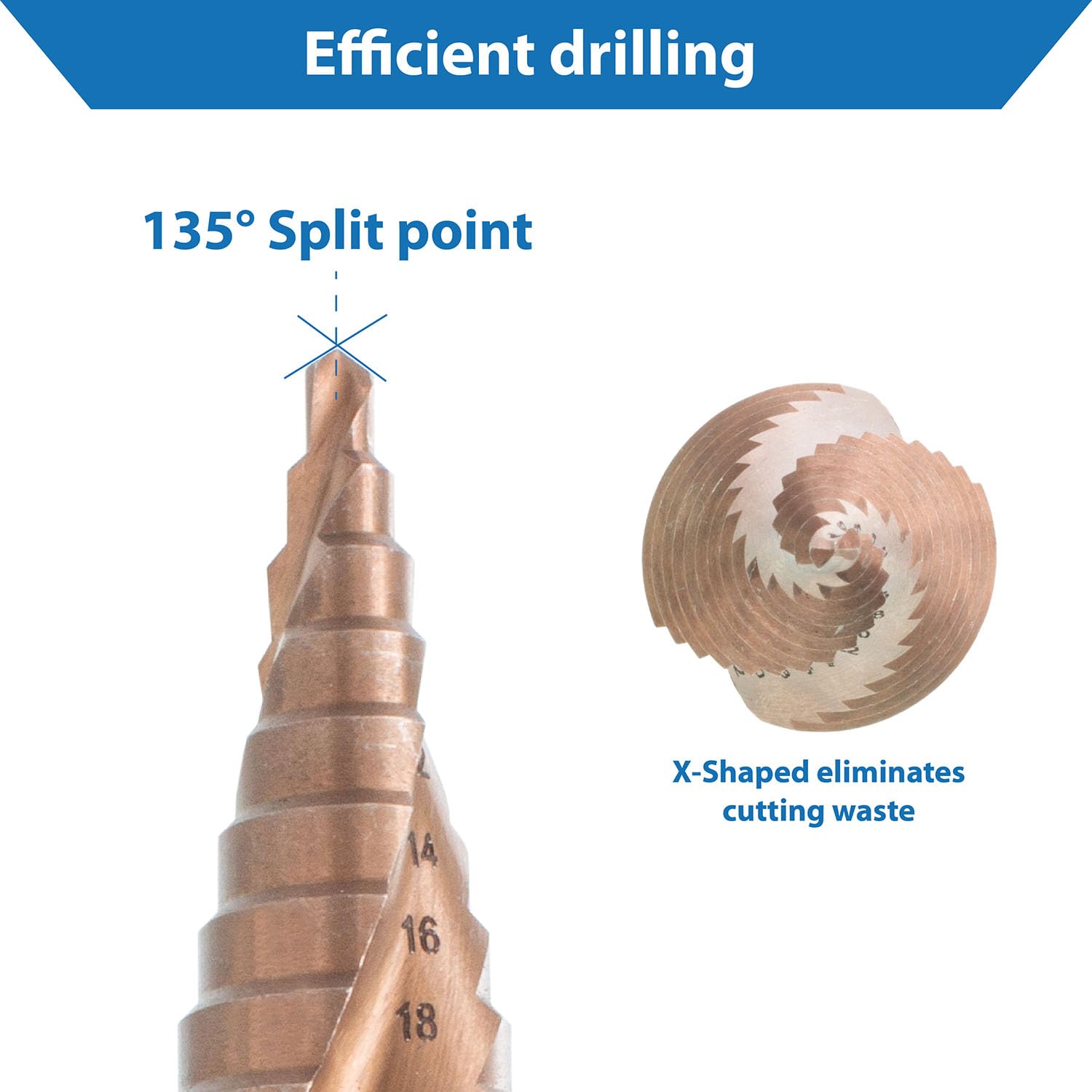 Each bit is designed with a two-flute spiral design that helps material particles escape more easily, leading to a cleaner drilling process and extending the service life of the bit. The 135-degree split point tip enhances cutting speed, reduces slipping, and increases wear resistance.